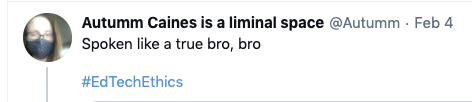 All this is to say that interactions with strangers can easily go amiss simply due to the unfamiliarity of the participants. The woman in Vancouver had no way to know that I am actually an atheist and developed the hymnal reference as a barb toward the church and the distain I have for both religion and education’s sheep-like mindless workbooks and rituals. It also didn’t come into her consideration that I had no idea about nor care for her sexual orientation and actually had to reference a photo taken at the end of the course to remember she existed at all. So too it is unfortunate that “Autumm Caines is a liminal space” doesn’t know enough about me to lump me into the “bro” category, but decided to come in hard with a reference dripping in connotations of misogyny. This encourages me to think that something about me or my post triggered a previous set of circumstances where I was closely enough related to be categorized and treated like a group and not an individual. And. something about her use of “bro’ triggered me to resent the characterization and made me again question how my experience affects others.