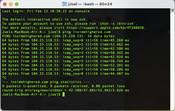 Next, (this is using the built-in Terminal app in a mac) Enter the command “ping insidehighered.com” and it returns “64 bytes from 104.25.118.53: icmp_seq=0 ttl=56 time=45.260 ms“. This may not look like much, but it exposes an important bit of information in the IPv4 network address (104.25.118.53). This is a unique public address connected to a network. This is important because it is impossible to know where on Earth the Domain Name System (DNS) entry www.insidehighered.com is pointing to just by itself. If the IP address that returns is the same as your local network, then the IT System is likely hosted by your internal organization. If it points to a public address, like this, it could be many different possibilities of ownership.
