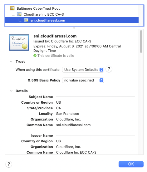 Click on the word “Certificate” and it pops up details. In this case the Certificate Authority is Cloudflare itself.